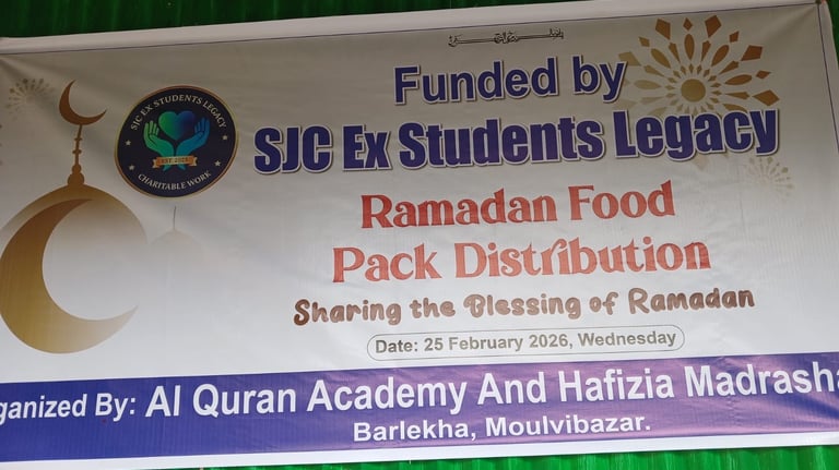 On 25 February 2026, the SJC Ex-Students Legacy team completed our Ramadan food distribution in Barlekha, Moulvibazar. It was a day filled with prayer and purpose. View our distribution videos below to see the community we served together. Please continue to support the projects. May Allah (SWT) accept it from us all.